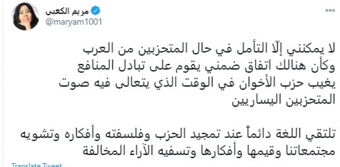 الكعبي تكشف العوامل المشتركة بين الإخوان واليساريين