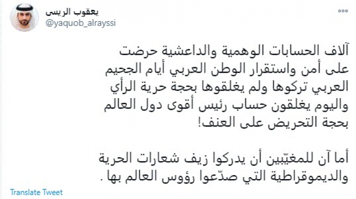 طرح الكاتب الإماراتي يعقوب الريسي، اليوم، عدة تساؤلات بشأن واقعة إغلاق حساب الرئيس الأمريكي دونالد ترامب على موقع "تويتر".