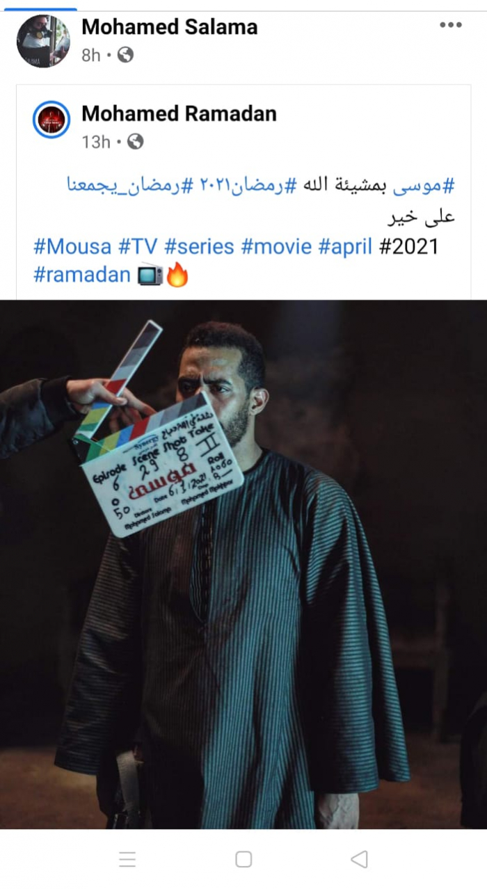 ونشر رمضان، الصورة عبر حسابه على موقع "فيس بوك"، وظهر خلالها ممسكا بسلاح آلي في يده، وهو يرتدي الجلباب الصعيدي، وعلّق: "موسى.. بمشيئة الله رمضان٢٠٢١.. رمضان يجمعنا على خير".