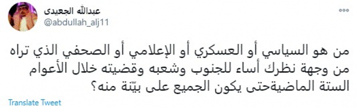 وقال في تغريدة عبر "تويتر" رصدها "المشهد العربي": "من هو السياسي أو العسكري أو الإعلامي أو الصحفي الذي تراه من وجهة نظرك أساء للجنوب وشعبه وقضيته خلال الأعوام الستة الماضية حتى يكون الجميع على بيّنة منه؟".