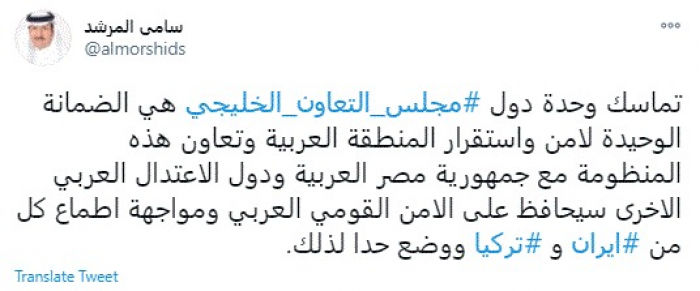 وقال في تغريدة عبر "تويتر" رصدها "المشهد العربي": "تماسك وحدة دول مجلس التعاون الخليجي هي الضمانة الوحيدة لأمن واستقرار المنطقة العربية وتعاون هذه المنظومة مع جمهورية مصر العربية ودول الاعتدال العربي الأخرى سيحافظ على الأمن القومي العربي ومواجهة أطماع كل من إيران وتركيا ووضع حدا لذلك".