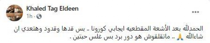 وكتب تاج الدين، عبر حسابه الشخصي على موقع "فيسبوك": "الحمدلله بعد الأشعة المقطعية إيجابي كورونا، بس قدها وقدود وهتعدي إن شاء الله، متقلقوش هو دور برد بس غلس حبتين".