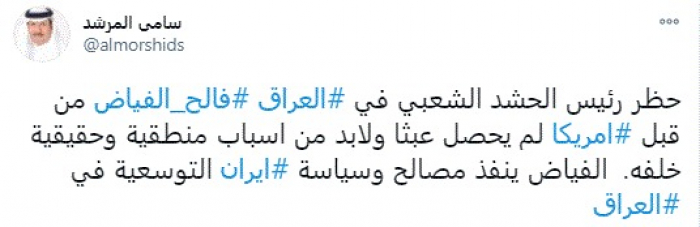 وقال في تغريدة عبر "تويتر" رصدها "المشهد العربي": "حظر رئيس الحشد الشعبي في العراق فالح الفياض من قبل أمريكا لم يحصل عبثا ولا بد من أسباب منطقية وحقيقية خلفه".