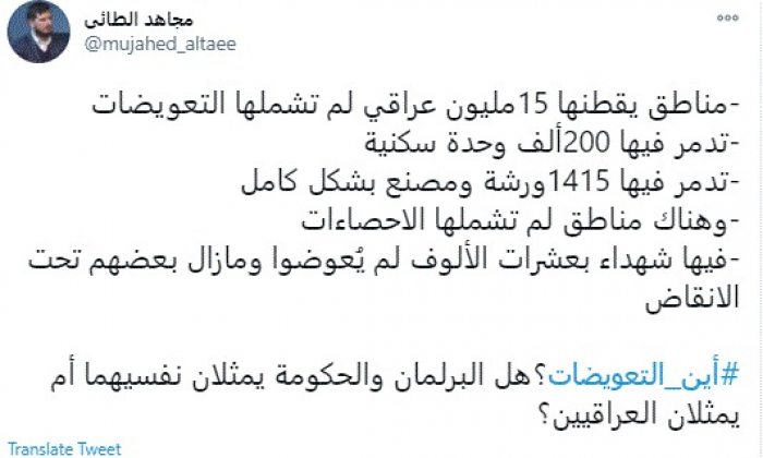 وقال في تغريدة عبر "تويتر" رصدها "المشهد العربي": "مناطق يقطنها 15مليون عراقي لم تشملها التعويضات - تدمر فيها 200ألف وحدة سكنية - تدمر فيها 1415ورشة ومصنع بشكل كامل - وهناك مناطق لم تشملها الاحصاءات - فيها شهداء بعشرات الألوف لم يُعوضوا وما زال بعضهم تحت الأنقاض".