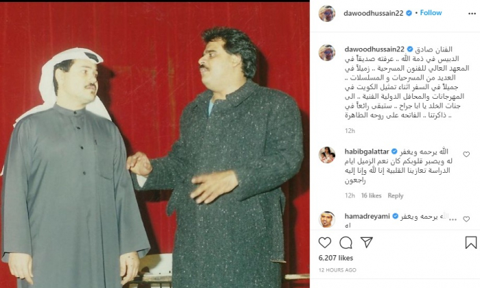 ونشر داود صورة تجمعهما، عبر حسابه الرسمي بموقع "إنستجرام"، علق :" الفنان صادق الدبيس في ذمة الله .. عرفته صديقاً في المعهد العالي للفنون المسرحية .. زميلاً في العديد من المسرحيات والمسلسلات .. جميلاً في السفر أثناء تمثيل الكويت في المهرجانات والمحافل الدولية الفنية .. إلى جنات الخلد يا أبا جراح .. ستبقى رائعاً في ذاكرتنا .. الفاتحة على روحه الطاهرة".