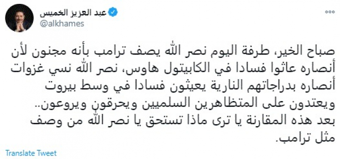 سخر الإعلامي السعودي عبدالعزيز الخميس، اليوم، من تصريحات الأمين العام لحزب الله حسن نصرالله عن الرئيس الأمريكي دونالد ترامب.