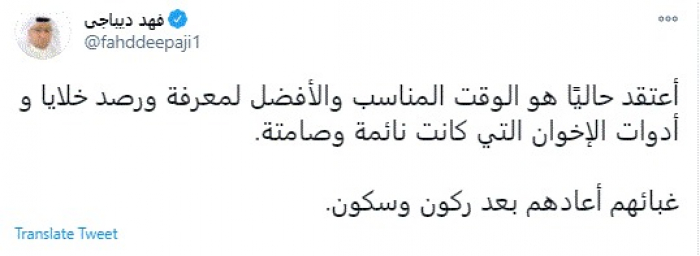 وقال في تغريدة عبر "تويتر" رصدها "المشهد العربي": "أعتقد حاليًا هو الوقت المناسب والأفضل لمعرفة ورصد خلايا و أدوات الإخوان التي كانت نائمة وصامتة. غبائهم أعادهم بعد ركون وسكون".