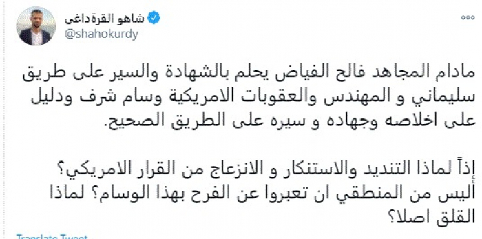 وقال في تغريدة عبر "تويتر" رصدها "المشهد العربي": "ما دام المجاهد فالح الفياض يحلم بالشهادة والسير على طريق سليماني والمهندس والعقوبات الامريكية وسام شرف ودليل على إخلاصه وجهاده وسيره على الطريق الصحيح".