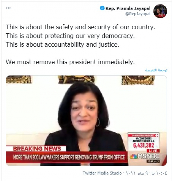 طالبت براميلا جايبال عضو الكونجرس الأمريكي، بعزل الرئيس الأمريكي المنتهية ولايته دونالد ترامب، عقب الفوضى التي شهدها مبنى الكابيتول من أنصار ومؤيدي ترامب، راصدة في مقطع فيديو الهلع الذي أصاب أعضاء الكونجرس والعاملين فيه جراء الاعتداءات التي وقعت عليهم.