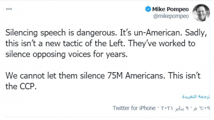 وكتب بومبيو في تغريدة نشرها عبر حسابه الشخصي بـ"تويتر": "إسكات الكلام أمر خطير إنه غير أمريكي، للأسف هذا ليس تكتيكًا جديدًا لليسار، لقد عملوا على إسكات الأصوات المعارضة لسنوات، لا يمكننا السماح لهم بإسكات 75 مليون أمريكي، هذا ليس الحزب الشيوعي الصيني".