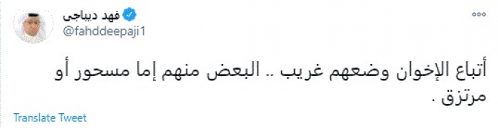 وقال في تغريدة عبر "تويتر" رصدها "المشهد العربي": "أتباع الإخوان وضعهم غريب .. البعض منهم إما مسحور أو مرتزق".