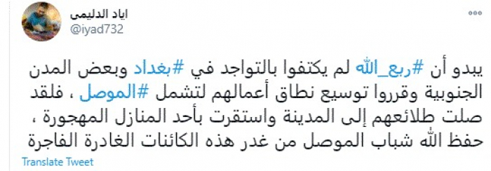 وقال في تغريدة عبر "تويتر" رصدها "المشهد العربي": "يبدو أن ربع الله لم يكتفوا بالتواجد في بغداد وبعض المدن الجنوبية وقرروا توسيع نطاق أعمالهم لتشمل الموصل، فلقد صلت طلائعهم إلى المدينة واستقرت بأحد المنازل المهجورة، حفظ الله شباب الموصل من غدر هذه الكائنات الغادرة الفاجرة".