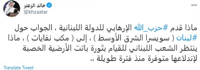 قال المحلل السياسي السعودي خالد الزعتر، اليوم، إن حزب الله حول لبنان إلى مكب نفايات، مُطالبًا الشعب اللبناني بالثورة ضده.