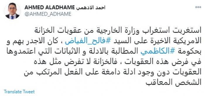 وقال في تغريدة عبر "تويتر" رصدها "المشهد العربي": "استغربت استغراب وزارة الخارجية من عقوبات الخزانة الأمريكية الأخيرة على السيد فالح الفياض، كان الأجدر بهم وبحكومة الكاظمي المطالبة بالأدلة والإثباتات التي اعتمدوها في فرض هذه العقوبات، فالخزانة لا تفرض مثل هذه العقوبات دون وجود أدلة دامغة على الفعل المرتكب من الشخص المعاقب".