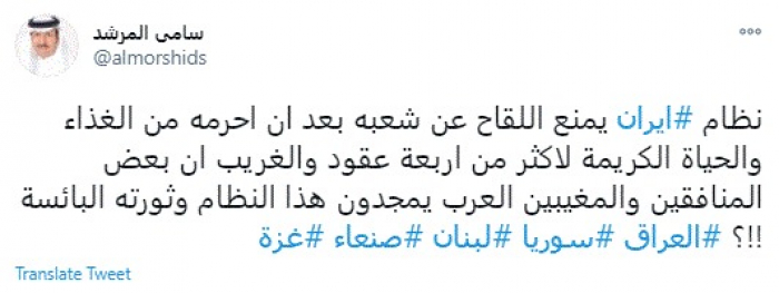 وقال في تغريدة عبر "تويتر" رصدها "المشهد العربي": "نظام إيران يمنع اللقاح عن شعبه بعد أن حرمه من الغذاء والحياة الكريمة لأكثر من أربعة عقود والغريب أن بعض المنافقين والمغيبين العرب يمجدون هذا النظام وثورته البائسة".
