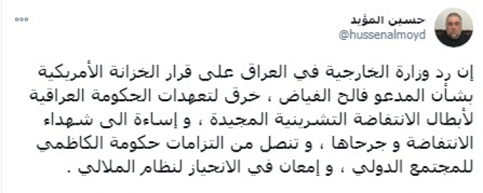 وقال في تغريدة على حسابه بموقع التدوين المصغر تويتر، اليوم إن: "رد وزارة الخارجية في العراق على قرار الخزانة الأمريكية بشأن المدعو فالح الفياض، خرق لتعهدات الحكومة العراقية لأبطال الانتفاضة التشرينية المجيدة".