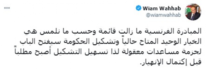 وشدد في تغريدة على حسابه بموقع التدوين المصغر تويتر، على أن: "المبادرة الفرنسية ما زالت قائمة، وحسب ما نلمس هي الخيار الوحيد المتاح حاليًا".