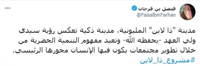 وقال في تغريدة على حسابه بموقع التدوين المصغر تويتر، اليوم إن: "مدينة (ذا لاين) المليونية، مدينة ذكية تعكس رؤية سيدي ولي العهد -يحفظه الله".