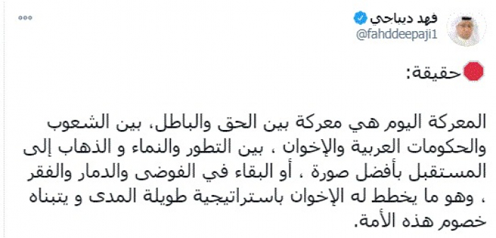 وكتب في تغريدة عبر "تويتر" رصدها "المشهد العربي": "حقيقة: المعركة اليوم هي معركة بين الحق والباطل، بين الشعوب والحكومات العربية والإخوان، بين التطور والنماء و الذهاب إلى المستقبل بأفضل صورة، أو البقاء في الفوضى والدمار والفقر، وهو ما يخطط له الإخوان باستراتيجية طويلة المدى ويتبناه خصوم هذه الأمة".