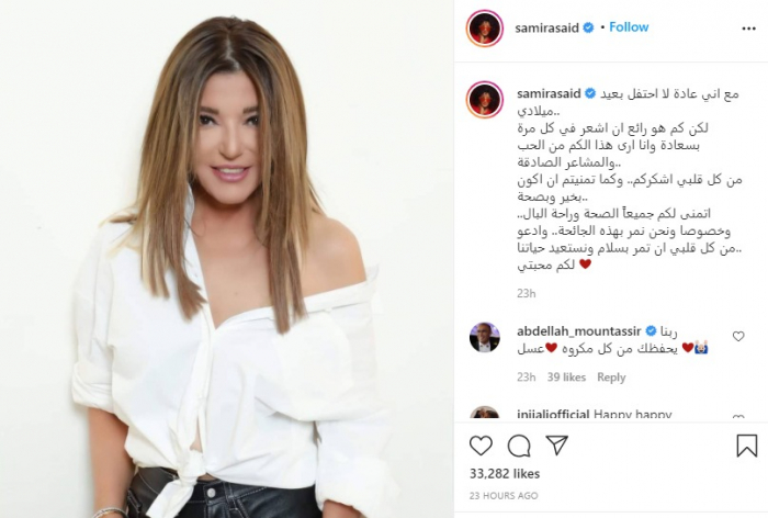 وكتبت سميرة، عبر حسابها على إنستجرام: "مع إني عادة لا أحتفل بعيد ميلادي .. لكن كم هو رائع أن أشعر في كل مرة بسعادة، وأنا أرى هذا الكم من الحب والمشاعر الصادقة..من كل قلبي أشكركم.. وكما تمنيتم أن أكون بخير وبصحة".