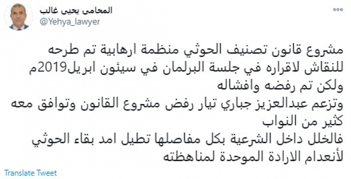 وكتب في تغريدة عبر "تويتر" رصدها "المشهد العربي": "مشروع قانون تصنيف الحوثي منظمة إرهابية تم طرحه للنقاش لإقراره في جلسة البرلمان في سيئون إبريل2019م ولكن تم رفضه وإفشاله وتزعم عبدالعزيز جباري تيار رفض مشروع القانون وتوافق معه كثير من النواب".