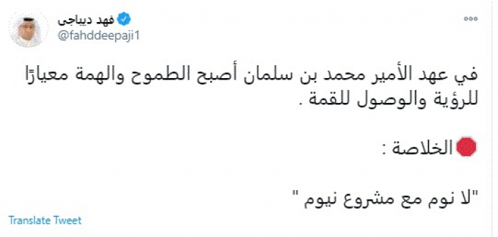 وقال في تغريدة عبر "تويتر" رصدها "المشهد العربي": "في عهد الأمير محمد بن سلمان أصبح الطموح والهمة معيارًا للرؤية والوصول للقمة. الخلاصة: لا نوم مع مشروع نيوم".