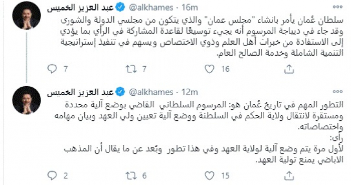 وقال في تغريدة عبر "تويتر" رصدها "المشهد العربي": "سلطان عُمان يأمر بانشاء مجلس عمان والذي يتكون من مجلسي الدولة والشورى وقد جاء في ديباجة المرسوم أنه يجيء توسيعًا لقاعدة المشاركة في الرأي بما يؤدي إلى الاستفادة من خبرات أهل العلم وذوي الاختصاص ويسهم في تنفيذ إستراتيجية التنمية الشاملة وخدمة الصالح العام".