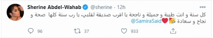 وكتبت شيرين، عبر حسابها على موقع "تويتر" موجهة كلماتها لسميرة سعيد: "كل سنة وانت طيبة وجميلة وناجحة يا أقرب صديقة لقلبي، يا رب سنة كلها صحة و نجاح و سعادة".