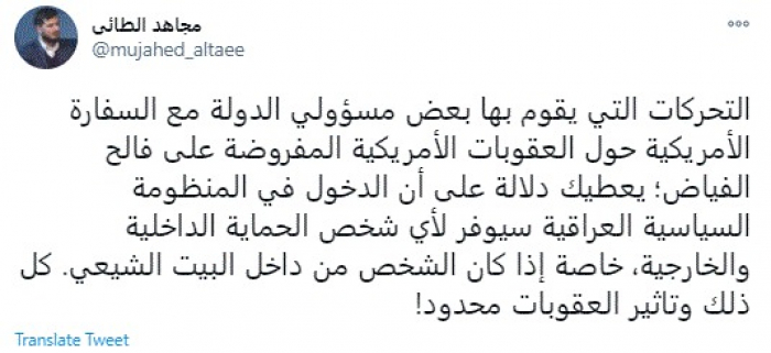 وقال في تغريدة عبر "تويتر" رصدها "المشهد العربي": " التحركات التي يقوم بها بعض مسؤولي الدولة مع السفارة الأمريكية حول العقوبات الأمريكية المفروضة على فالح الفياض؛ يعطيك دلالة على أن الدخول في المنظومة السياسية العراقية سيوفر لأي شخص الحماية الداخلية والخارجية، خاصة إذا كان الشخص من داخل البيت الشيعي. كل ذلك وتاثير العقوبات محدود".