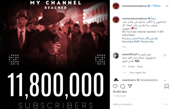 ونشر "رمضان" صورة، عبر حسابه الرسمي بموقع "إنستجرام"، وعلق: " شكراً لـ١١مليون و٨٠٠ ألف مشترك في قناتي على يوتيوب، ربنا يقدرني على إسعاد كل جمهوري".