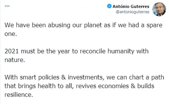 وأضاف أن: "عام 2021 يجب أن يكون عام التوفيق بين الإنسانية والطبيعة"، مؤكدا أنه: "من خلال السياسات والاستثمارات الذكية، يمكننا رسم مسار يجلب الصحة للجميع وينعش الاقتصادات ويبني المرونة".