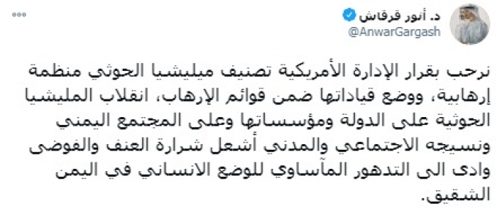 عبر وزير الدولة الإماراتي للشئون الخارجية، أنور قرقاش عن ترحيبه بقرار تصنيف مليشيا الحوثي منظمة إرهابية.