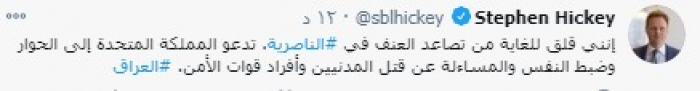 وقال في تغريدة على حسابه بموقع التدوين المصغر تويتر، اليوم إنني: "قلق للغاية من تصاعد العنف في الناصرية".