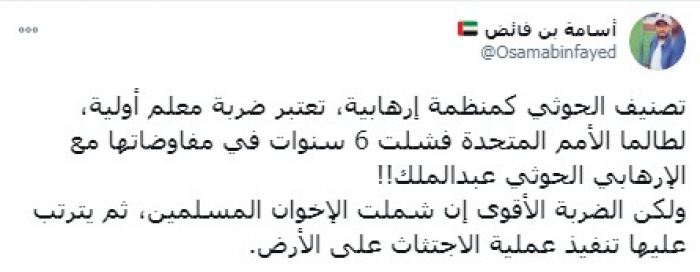 وقال في تغريدة على حسابه بموقع التدوين المصغر تويتر، اليوم إن: "تصنيف الحوثي كمنظمة إرهابية، تعتبر ضربة معلم أولية"، مشيرا إلى أنه: "لطالما الأمم المتحدة فشلت 6 سنوات في مفاوضاتها مع الإرهابي الحوثي عبدالملك!!".