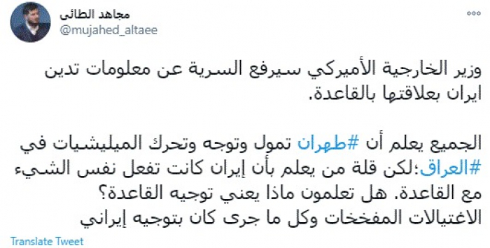وقال في تغريدة عبر "تويتر" رصدها "المشهد العربي": "وزير الخارجية الأميركي سيرفع السرية عن معلومات تدين إيران بعلاقتها بالقاعدة".
