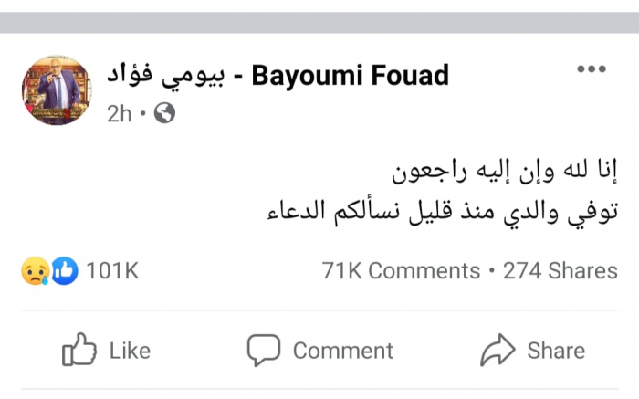 وكتب بيومي: "إنا لله وإنا إليه راجعون... توفي منذ قليل والدي، نسألكم الدعاء".