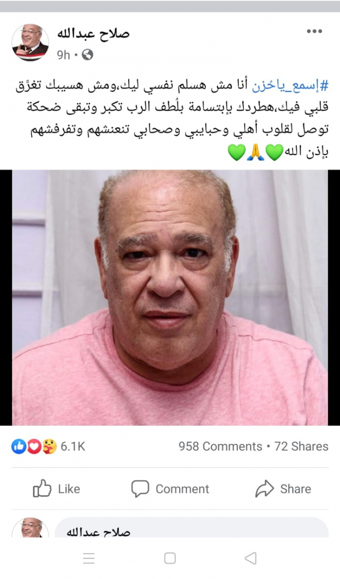 ونشر عبد الله، صورة له عبر حسابه على موقع "فيس بوك" ويكسو وجهه الحزن، وعلّق: "اسمع يا حُزن.. أنا مش هسلم نفسي ليك، ومش هسيبك تغرَّق قلبي فيك، هطردك بابتسامة، بلُطف الرب تكبر وتبقى ضحكة، توصل لقلوب أهلي وحبايبي وصحابي، تنعنشهم وتفرفشهم بإذن الله".