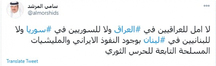 وقال في تغريدة عبر "تويتر" رصدها "المشهد العربي": "لا أمل للعراقيين في العراق ولا للسوريين في سوريا ولا للبنانيين في لبنان بوجود النفوذ الإيراني والمليشيات المسلحة التابعة للحرس الثوري".