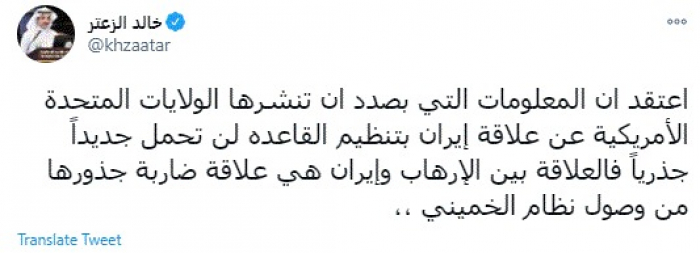 وكتب في تغريدة عبر "تويتر" رصدها "المشهد العربي": "اعتقد أن المعلومات التي بصدد أن تنشرها الولايات المتحدة الأمريكية عن علاقة إيران بتنظيم القاعدة لن تحمل جديداً جذرياً فالعلاقة بين الإرهاب وإيران هي علاقة ضاربة جذورها من وصول نظام الخميني".