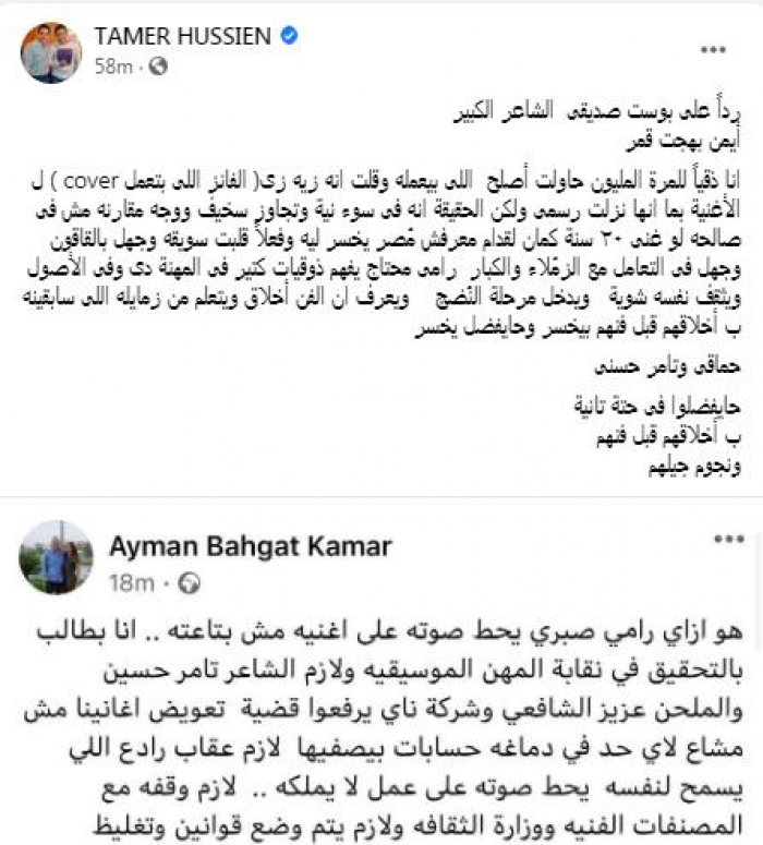 وكتب تامر عبر حسابه بموقع "فيسبوك": "ردا على بوست صديقى الشاعر الكبير أيمن بهجت قمر، أنا ذوقيا للمرة المليون حاولت أصلح اللى بيعمله وقلت إنه زيه زي الفانز اللي بتعمل cover للأغنية بما أنها نزلت رسمي، ولكن الحقيقة أن في سوء نية وتجاوز سخيف ووجه مقارنة مش في صالحه لو غنى 20 سنة كمان لقدام".