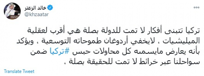 هاجم المحلل السياسي السعودي خالد الزعتر، اليوم، النظام التركي، مؤكدًا أن الرئيس رجب طيب أردوغان لا يخفي طموحاته التوسعية.