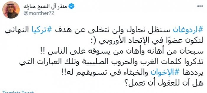 علق المدون السعودي البارز منذر آل الشيخ مبارك، اليوم، على محاولات الرئيس التركي رجب طيب أردوغان للتودد للاتحاد الأوروبي.