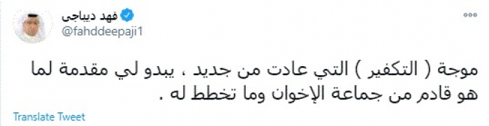 وكتب في تغريدة عبر "تويتر" رصدها "المشهد العربي": "موجة (التكفير) التي عادت من جديد، يبدو لي مقدمة لما هو قادم من جماعة الإخوان وما تخطط له".