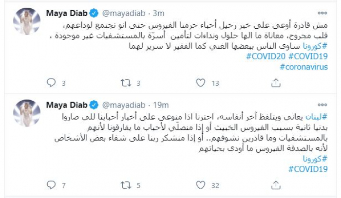 عبرت الفنانة اللبنانية مايا دياب عن قلقها الشديد من تزايد أعداد المصابين بفيروس كورونا فى لبنان، وكتبت عبر حسابها على تويتر :"لبنان يعانى ويلفظ آخر أنفاسه، احترنا إذا بنوعى على أخبار أحبابنا للى صاروا بدنيا ثانية بسبب الفيروس الخبيث أو إذا بنصلّى لأحباب ما يفارقونا لأنهم بالمستشفيات وما قادرين نشوفهم.. أو إذا بنشكر ربنا على شفاء بعض الأشخاص لأنه بالصدفة الفيروس ما أودى بحياتهم".