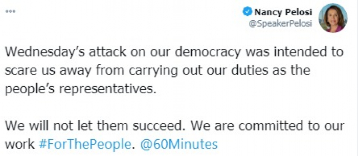 وأوضحت في تغريدة على حسابها بموقع التدوين المصغر تويتر، اليوم أنه: "كان الهدف من هجوم الأربعاء على ديمقراطيتنا تخويفنا من القيام بواجباتنا كممثلين للشعب".
