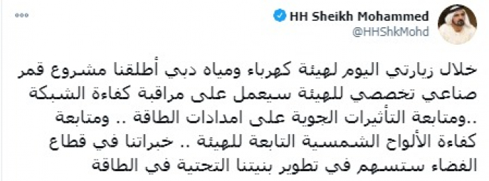 وقال في تغريدة على حسابه بموقع التدوين المصغر تويتر، اليوم إنه: "خلال زيارتي اليوم لهيئة كهرباء ومياه دبي أطلقنا مشروع قمر صناعي تخصصي للهيئة سيعمل على مراقبة كفاءة الشبكة".
