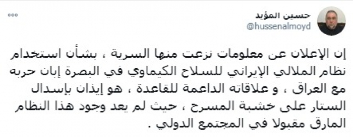أكد الناشط السياسي حسين المؤيد أن رفع السرية عن معلومات باستخدام نظام الملالي للسلاح الكيماوي في البصرة أثناء حربه مع العراق، ودعمه لتنظيم القاعدة الإرهابي، تبرهن على أنه نظام مارق.