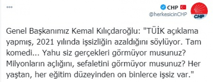 ونشر الحساب الرسمي للحزب على موقع التدوين المصغر تويتر تصريحات رئيسه، اليوم قائلا: "أصدر مركز الإحصاء التركي بيانًا وقال إن البطالة آخذة في الانخفاض في عام 2021".