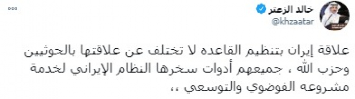 وشدد في تغريدة على حسابه بموقع التدوين المصغر تويتر، اليوم على أن: "علاقة إيران بتنظيم القاعده لا تختلف عن علاقتها بالحوثيين وحزب الله".