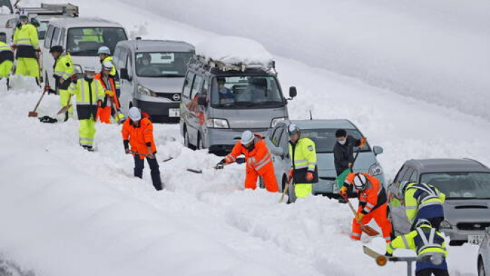 واحتجزت الثلوج، حوالي 1200 سيارة على طول الساحل الغربي الياباني وإلى انقطاع الكهرباء عن آلاف المنازل.
